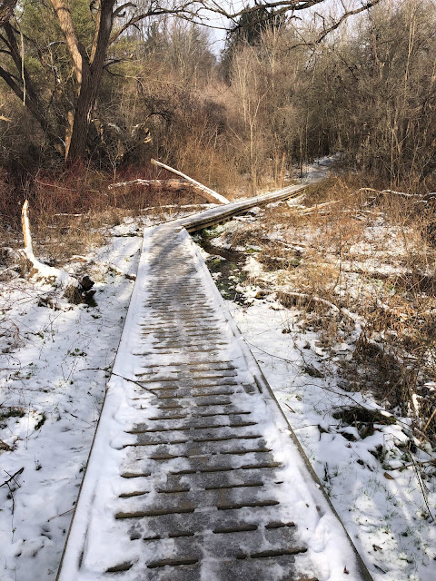 Todays hike started at the Artaban Road parking lot ($11 parking for the day). We parked our second car on Davidson Boulevard in Dundas (free roadside parking). There are no facilities at either location; however, there are washrooms at the trail centre in Dundas Valley Conservation area. On our last hike (Dec 12th) we accidentally went past our terminus on Artaban road and continued along the Bruce for about a kilometre before turning around and heading back to our car. The first couple of pictures are from the Dec 12th hike. Conditions today were very icy, despite the mild temperatures. I definitely recommend being prepared with spikes and poles as conditions on the trail can differ greatly.